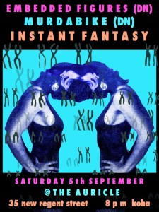 Embedded Figures is bringing with her fellow Dunedin duo Murdabike – robotic prophets of boom, with whispered vocals, live and in-effect, the beautiful analog – and also appearing will be local Christchurch neon synth drone ego-minor Instant Fantasy!!
